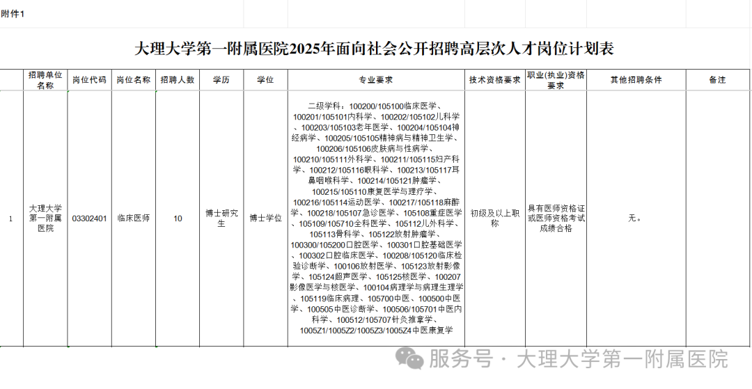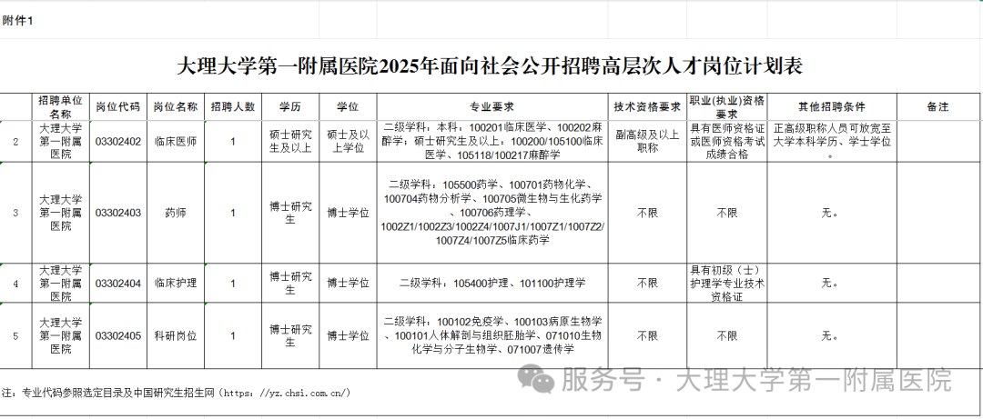 1.大理大學(xué)第一附屬醫(yī)院2025年面向社會公開招聘高層次人才崗位計劃表