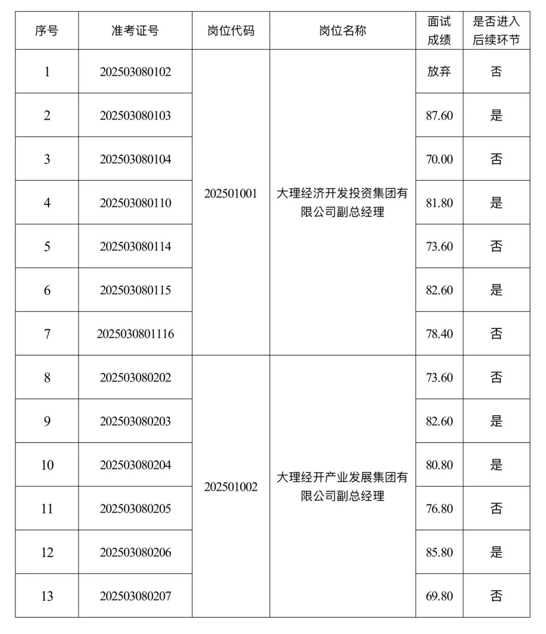 根據(jù)《大理經(jīng)濟(jì)技術(shù)開發(fā)區(qū)管理委員會(huì)下屬國有企業(yè)面向社會(huì)公開招聘高級(jí)管理人才公告》要求,大理經(jīng)濟(jì)技術(shù)開發(fā)區(qū)管理委員會(huì)下屬國有企業(yè)面向社會(huì)公開招聘高級(jí)管理人才面試工作已于2025年3月8日完成,現(xiàn)將面試成績(jī)及后續(xù)相關(guān)事宜公告如下: