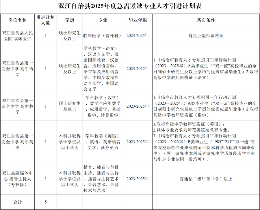 根據(jù)《臨滄市人才招引三年行動計劃(2023-2025年)》《臨滄市人力資源和社會保障局關(guān)于進一步做好事業(yè)單位急需緊缺人才引進工作的通知》(臨人社發(fā)〔2024〕139號)和《中共雙江縣人才工作領導小組關(guān)于進一步做好事業(yè)單位急需緊缺專業(yè)人才引進工作的通知》(雙黨人才〔2025〕3號)精神,我縣2025年計劃公開引進急需緊缺專業(yè)人才5人,現(xiàn)將有關(guān)事項公告如下: