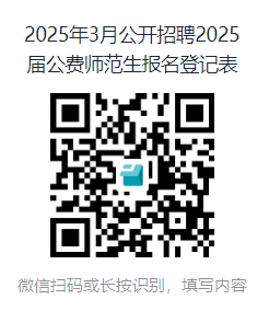 此次公開(kāi)招聘不接受現(xiàn)場(chǎng)、短信或來(lái)電報(bào)名。應(yīng)聘人員掃描2025屆公費(fèi)師范生招聘登記表二維碼進(jìn)行報(bào)名。此次公開(kāi)招聘不收取任何費(fèi)用。
