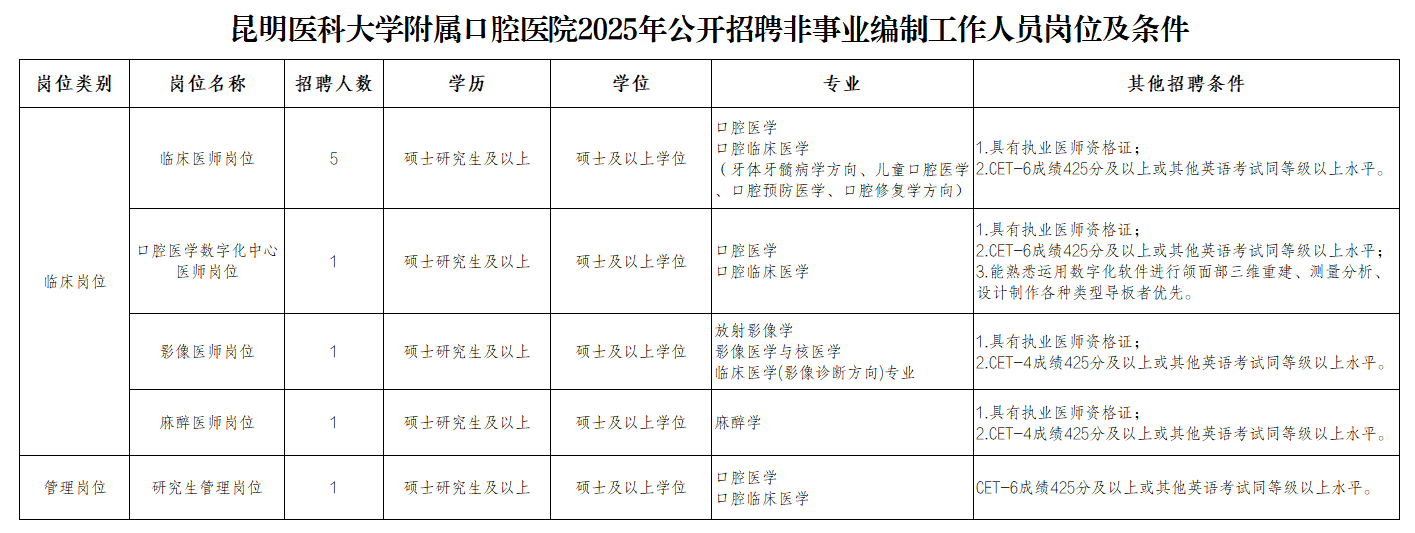 昆明醫(yī)科大學(xué)附屬口腔醫(yī)院本次公開(kāi)招聘非事業(yè)編制工作人員9名,具體如下: