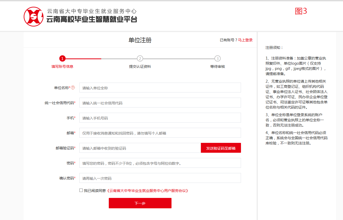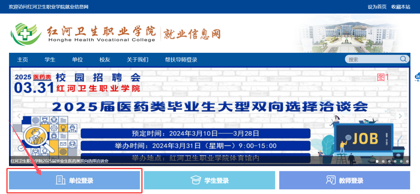 注冊(cè)登錄:參會(huì)單位須于3月28日(星期五)之前登錄紅河衛(wèi)生職業(yè)學(xué)院就業(yè)信息網(wǎng)(http://hhwzy.ynbys.cn/),選擇“單位登錄——立即注冊(cè)”填寫單位具體信息申請(qǐng)入駐我校(操作流程如圖1、圖2、圖3所示),等待審核通過(已在我校就業(yè)信息網(wǎng)注冊(cè)過的單位跳過此步,無需重復(fù)注冊(cè))。