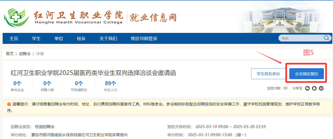 (二)預(yù)定展位:點(diǎn)擊“紅河衛(wèi)生職業(yè)學(xué)院2025屆醫(yī)藥類畢業(yè)生大型雙向選擇洽談會(huì)”端口進(jìn)入“企業(yè)預(yù)定展位”(操作流程如圖4、圖5所示)。