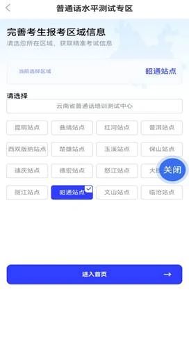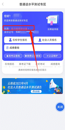 完成實名認(rèn)證后,在APP首頁找到“普通話測試報名”,點擊進(jìn)入普通話水平測試專區(qū)界面,選擇“云南省普通話培訓(xùn)測試中心”后,點擊“進(jìn)入首頁”。