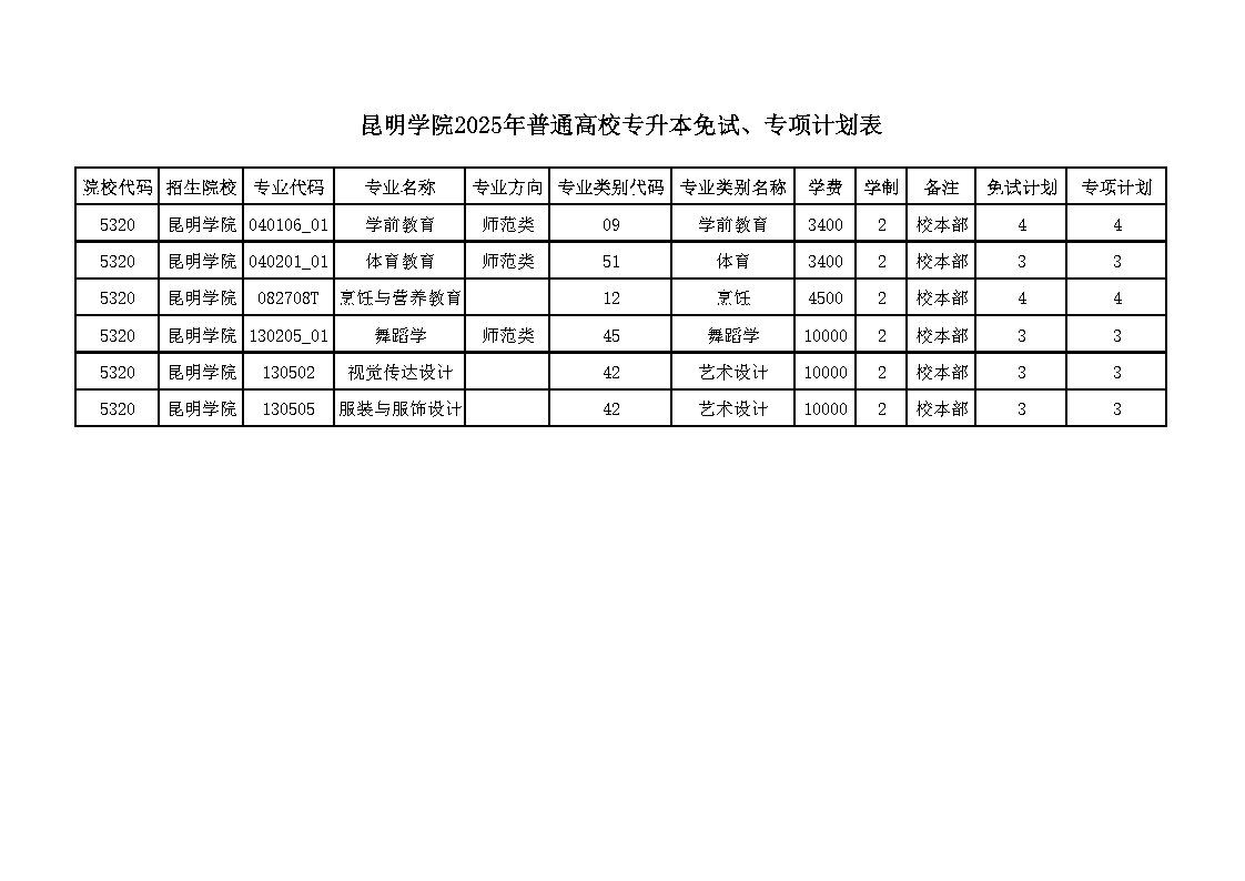 昆明學(xué)院2025年普通高校專升本免試、專項計劃表