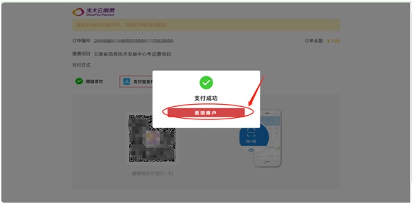 4、支付成功,會出現(xiàn)“支付成功”提示,點擊“返回商戶”回到報名系統(tǒng)。