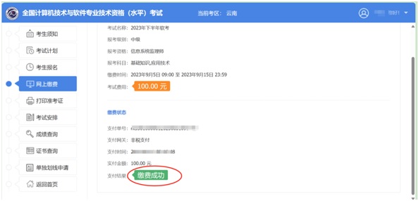 5、報名系統(tǒng)中“網(wǎng)上繳費”界面,顯示“繳費成功”。