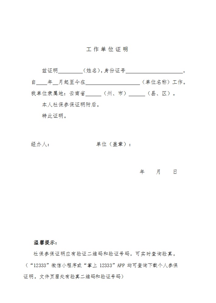 2.實際工作地在單獨劃線地區(qū)的工作單位證明(必須包括姓名、身份證號、工作單位及工作所在地地址等,樣表在www.ynxr.com云南軟考網(wǎng)2025年上半年報名通知附件下載)、本人在單獨劃線地區(qū)社保參保證明(加蓋單位公章)。社保參保證明應(yīng)有驗證二維碼和驗證號碼,可實時查詢驗真。(“12333”微信小程序或“掌上12333”APP均可查詢下載個人參保證明,文件頁眉處有驗真二維碼和驗證號碼)