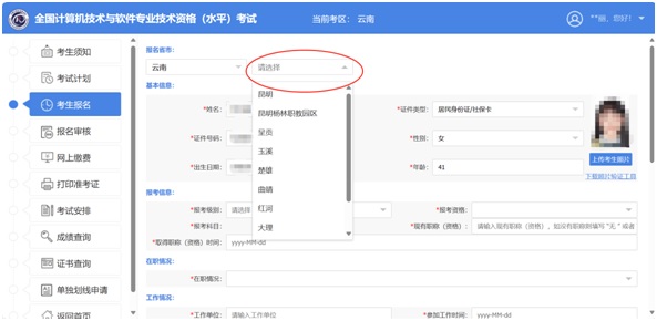 2、點選左側(cè)相應(yīng)欄目查看考生須知、考試計劃等。點選“考試報名”,進入報名界面,進行信息填寫(先選擇“報名省市”,選擇就近地區(qū),當次報考資格等詳細說明在“考生須知”中查閱):