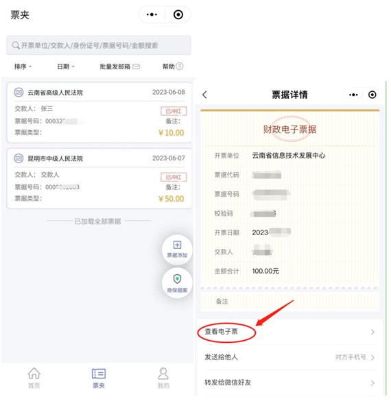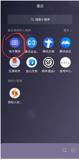 2、注冊之后,點小程序中間的“票夾”按鈕,就可以查看和下載已經(jīng)開出的電子票: