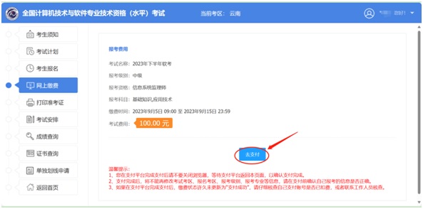 1、報名審核通過后,點擊左側(cè)“網(wǎng)上繳費”,進入繳費界面,核對報名信息無誤后,點擊“去支付”:
