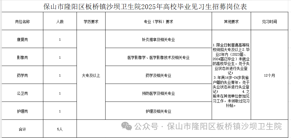 保山市隆陽(yáng)區(qū)板橋鎮(zhèn)沙壩衛(wèi)生院2025年見(jiàn)習(xí)生招聘公告