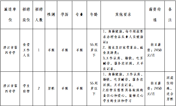 澄江市第中學(xué)因工作需要,委托澄江市啟澄人力資源有限責(zé)任公司,面向社會公開招聘學(xué)生宿管崗位2人、食堂炊事員1人,現(xiàn)將有關(guān)事項公告如下: