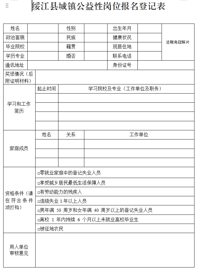 附件:綏江縣城鎮(zhèn)公益性崗位報(bào)名登記表