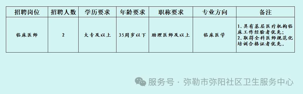 為加強基層醫(yī)療衛(wèi)生人才隊伍建設(shè),提升社區(qū)衛(wèi)生服務(wù)能力,經(jīng)研究決定,彌勒市彌陽社區(qū)衛(wèi)生服務(wù)中心現(xiàn)面向社會公開招聘合同制臨床醫(yī)師2名。具體事項公告如下: