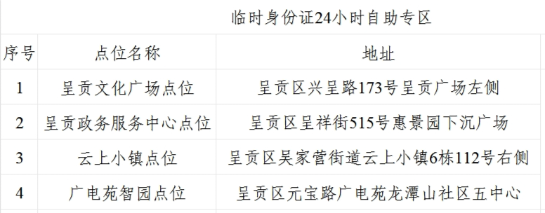 呈貢區(qū)政務(wù)服務(wù)管理局在以下4個(gè)地點(diǎn)為因忘記攜帶、遺失身份證的考生提供臨時(shí)身份證打印服務(wù)。