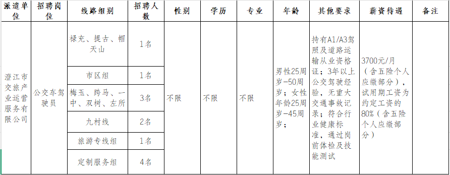 本次計(jì)劃公開招聘公交車駕駛員12名。報(bào)考人員在符合招聘基本條件基礎(chǔ)上,需符合崗位招聘條件,具體崗位及資格范圍條件詳見下表: