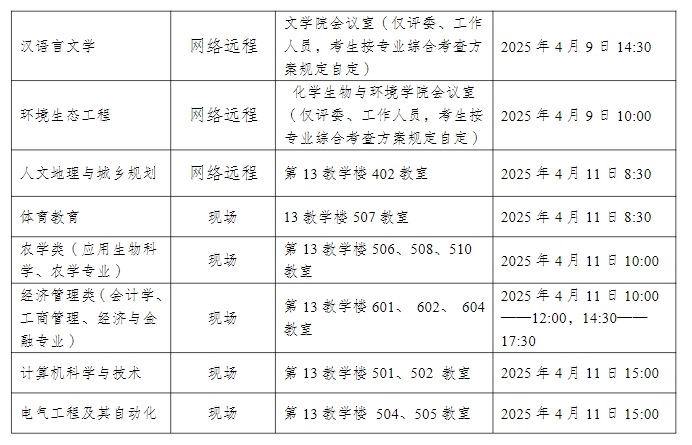 (一)面試:網(wǎng)絡(luò)遠程面試專業(yè):社會工作、漢語言文學(xué)小學(xué)教育、環(huán)境生態(tài)工程、人文地理與城鄉(xiāng)規(guī)劃等專業(yè)采用網(wǎng)絡(luò)遠程面試考查方式。面試考查滿分100分,面試考查內(nèi)容及打分表見各專業(yè)綜合考查方案;體育教育專業(yè)現(xiàn)場面試,采用現(xiàn)場抽題回答,評委現(xiàn)場打分,適用體育教育專業(yè)計分表計分。