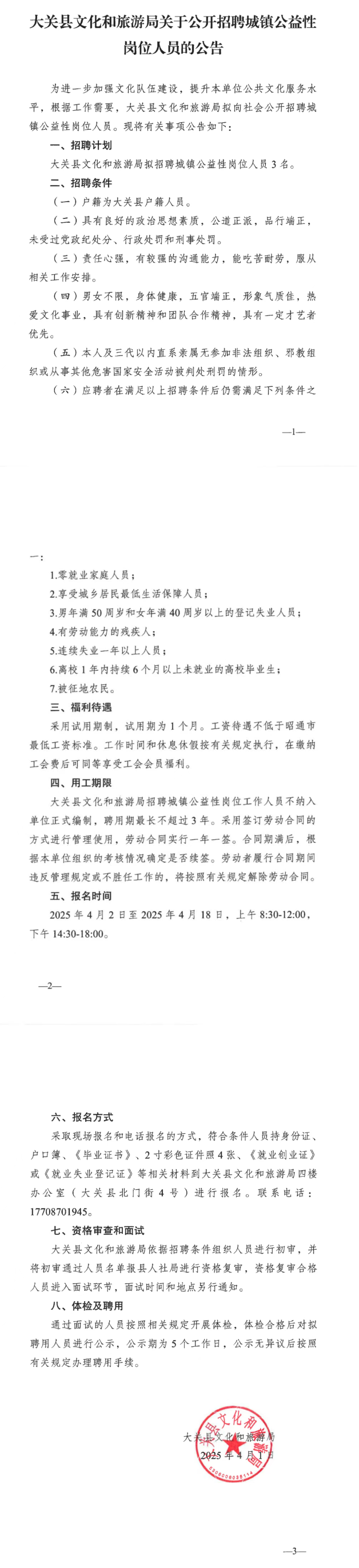 大關(guān)縣文化和旅游局關(guān)于公開招聘城鎮(zhèn)公益性崗位人員的公告