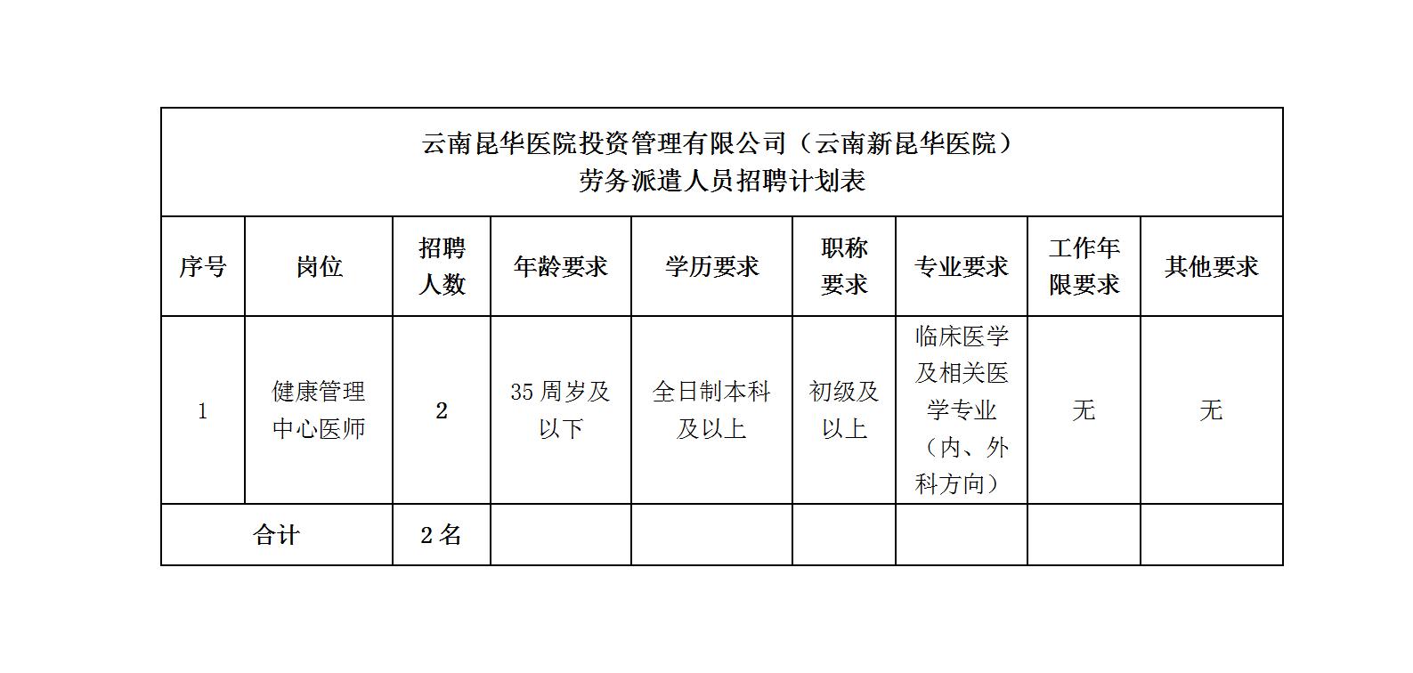 云南昆華醫(yī)院投資管理有限公司(云南新昆華醫(yī)院)本次招聘崗位用工方式為勞務(wù)派遣,錄用人員和第三方勞務(wù)派遣公司簽訂勞動合同,派遣至本單位工作。公開招聘1個崗位,共招聘工作人員2名,具體詳見下表: