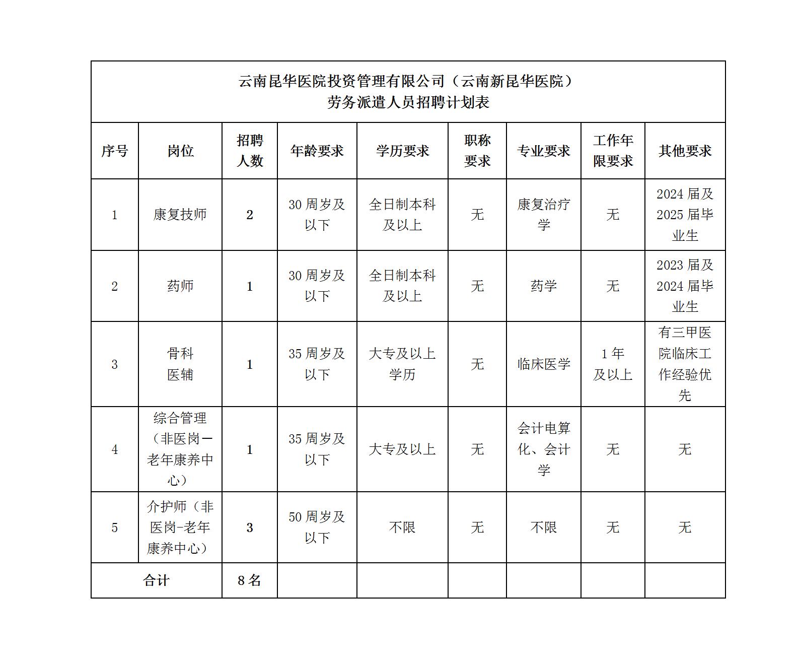 云南昆華醫(yī)院投資管理有限公司(云南新昆華醫(yī)院)本次招聘崗位用工方式為勞務(wù)派遣,錄用人員和第三方勞務(wù)派遣公司簽訂勞動合同,派遣至本單位工作。公開招聘5個(gè)崗位,共招聘工作人員8名,具體詳見下表: