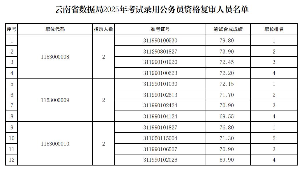 從報考云南省數(shù)據(jù)局2025年公務(wù)員考試錄用崗位,筆試成績達到云南省2025年公務(wù)員考試筆試最低合格分數(shù)線以上考生中,根據(jù)筆試成績從高到低順序,按照不超過職位招錄計劃數(shù)2倍的比例,確定進入資格復(fù)審人員,名單見附件。