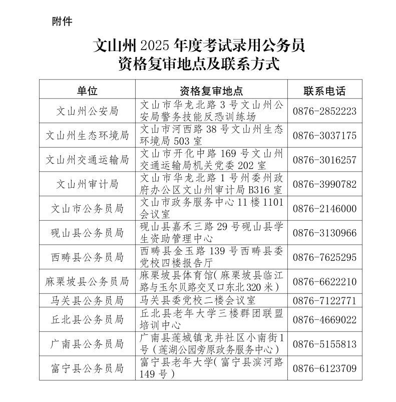 附件:文山州2025年度考試錄用公務(wù)員資格復(fù)審地點(diǎn)及聯(lián)系方式