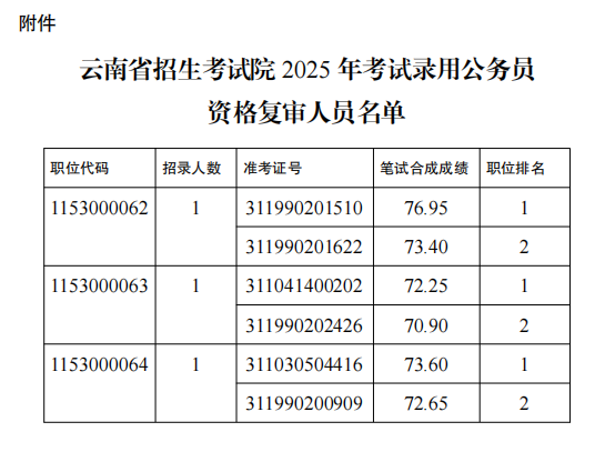 從報(bào)考云南省招生考試院2025年公務(wù)員考試錄用崗位筆試成績(jī)達(dá)到云南省2025年公務(wù)員考試筆試最低合格分?jǐn)?shù)線以上考生中,根據(jù)筆試成績(jī)從高到低順序,按照不超過(guò)職位招錄計(jì)劃數(shù)2倍的比例,確定進(jìn)入資格復(fù)審人員。名單見(jiàn)附件。