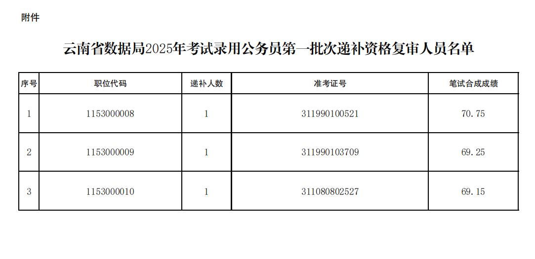 附件:云南省數(shù)據(jù)局2025年考試錄用公務(wù)員第一批次遞補(bǔ)資格復(fù)審人員名單