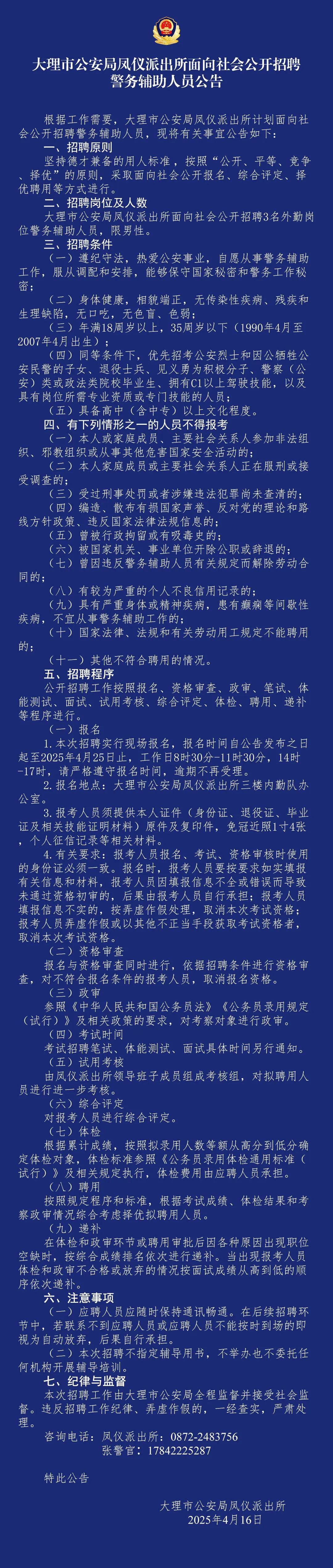 大理市公安局鳳儀派出所面向社會公開招聘警務(wù)輔助人員公告