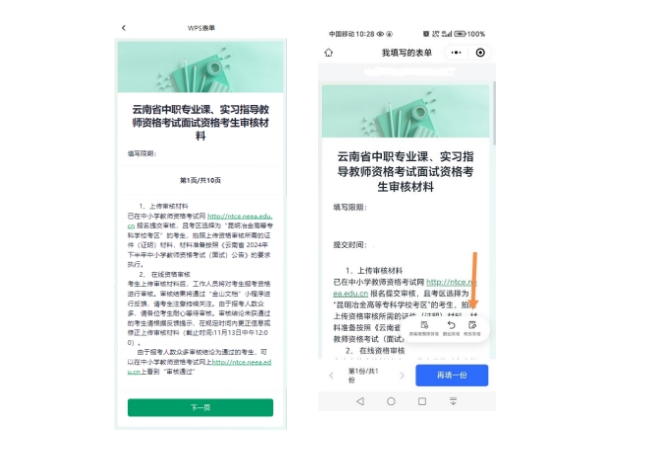 已在中小學(xué)教師資格考試網(wǎng) http://ntce.neea.edu.cn 報(bào)名提交審核,且考區(qū)選擇為“昆明冶金高等??茖W(xué)??紖^(qū)” 的考生,拍照上傳資格審核所需的證件(證明) 材料,材料 準(zhǔn)備按照《云南省 2025 年上半年中小學(xué)教師資格考試(面 試)公告》的要求執(zhí)行,上傳單個(gè)文件大小不超過(guò) 5M。具體 操作指引和金山文檔小程序二維碼詳見(jiàn)附件,請(qǐng)考生務(wù)必對(duì) 照指引進(jìn)行操作。
