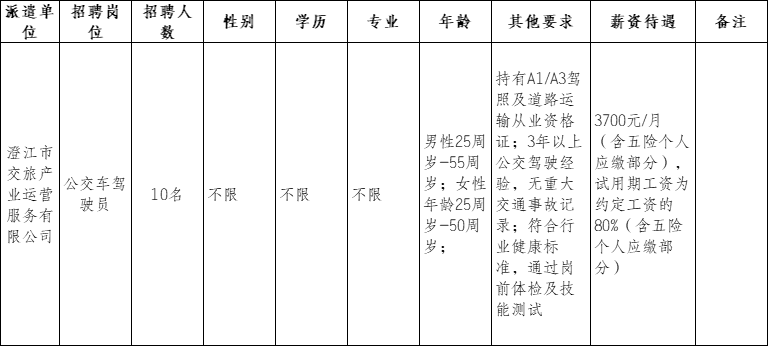 本次計(jì)劃公開招聘公交車駕駛員10名。報(bào)考人員在符合招聘基本條件基礎(chǔ)上,需符合崗位招聘條件,具體崗位及資格范圍條件詳見下表:
