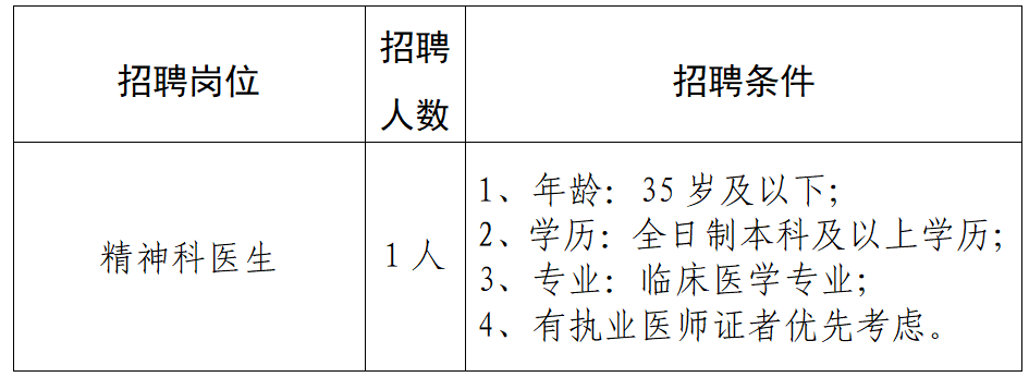 根據(jù)醫(yī)院業(yè)務(wù)發(fā)展需求,現(xiàn)需招聘精神科醫(yī)生1人,具體招聘條件如下: