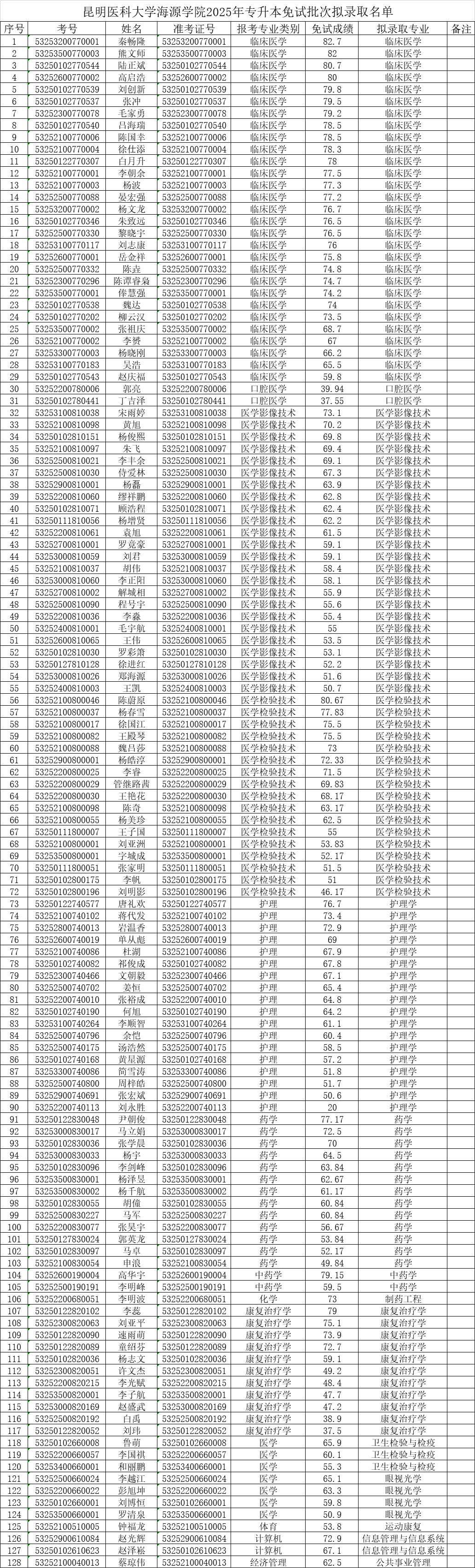 昆明醫(yī)科大學海源學院關于2025年云南省專升本免試批次擬錄取名單的公示