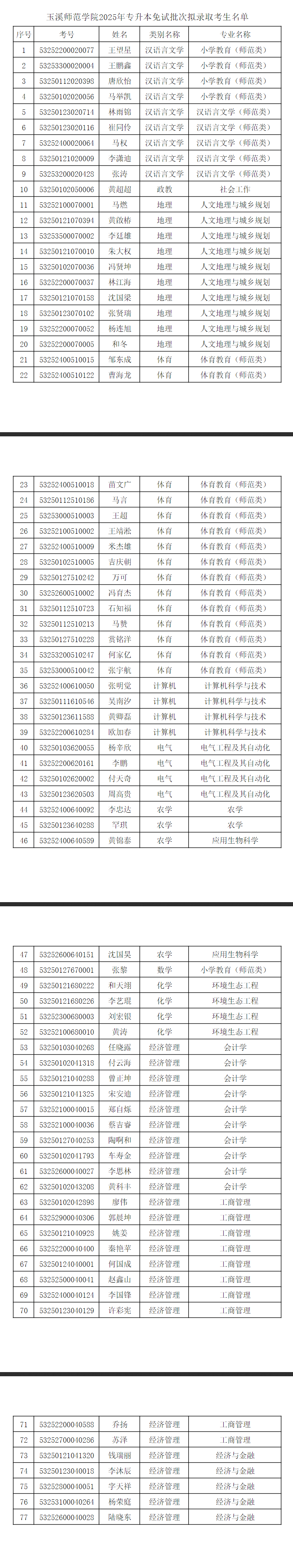 根據(jù)《云南省教育廳關(guān)于印發(fā)2025年普通高等學(xué)校專升本統(tǒng)一考試和免試招生工作辦法的通知》相關(guān)規(guī)定,我校于2025年4月11日完成了專升本免試生綜合考查工作,將考查結(jié)果進行了公示并上報云南省招生考試院。經(jīng)云南省招生考試院對專升本免試批次平行志愿投檔,現(xiàn)將我校2025年專升本免試批次擬錄取考生名單公示如下,公示期為2025年4月27日至4月30日,公示期內(nèi)如有異議,請向玉溪師范學(xué)院招生辦公室或玉溪師范學(xué)院紀(jì)檢處反映。