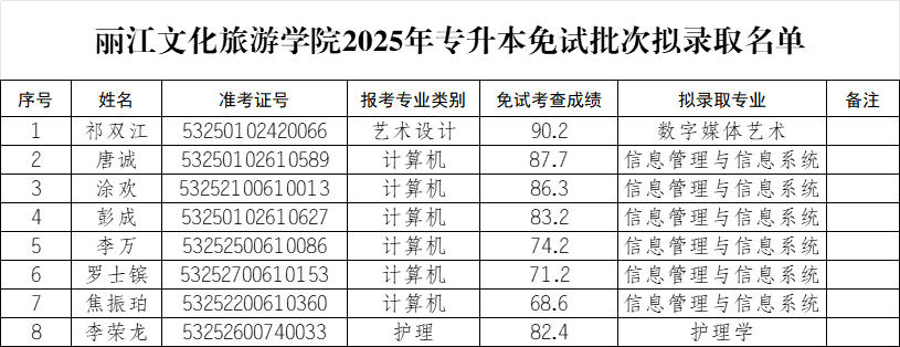 麗江文化旅游學(xué)院2025年專升本免試批次預(yù)錄取名單