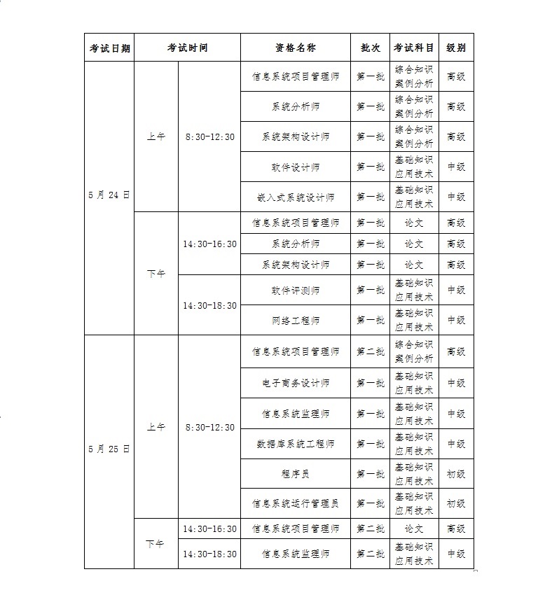 按照工業(yè)和信息化部教育與考試中心《關(guān)于2025年上半年計算機(jī)技術(shù)與軟件專業(yè)技術(shù)資格(水平)考試批次安排的通知》(工信教〔2025〕16號)文件精神,2025年上半年計算機(jī)技術(shù)與軟件專業(yè)技術(shù)資格(水平)考試云南考區(qū)考試批次安排如下:
