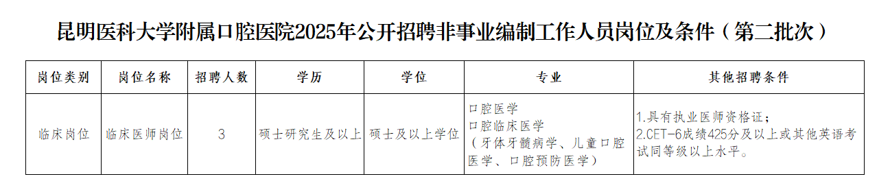 昆明醫(yī)科大學(xué)附屬口腔醫(yī)院本次公開招聘非事業(yè)編制工作人員3名,具體招聘崗位及招聘條件如下: