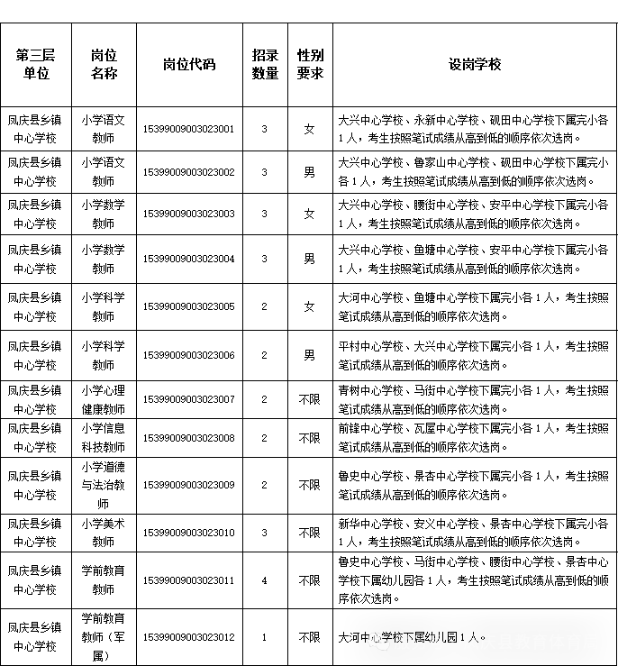 根據(jù)《臨滄市人力資源和社會保障局關(guān)于2025年全市事業(yè)單位公開招聘工作人員考試的公告》有關(guān)要求,鳳慶縣公開招聘鄉(xiāng)鎮(zhèn)小學(xué)教師30名,分為12個大崗位進行招聘。為做好30名鄉(xiāng)鎮(zhèn)小學(xué)教師的資格復(fù)審、體檢、考察和聘用工作,經(jīng)縣人民政府審核同意,現(xiàn)將大崗位學(xué)校設(shè)置公告如下: