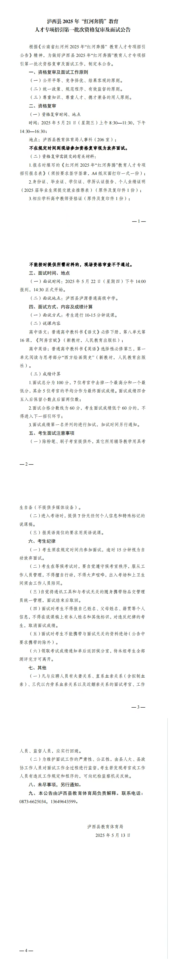瀘西縣2025年“紅河奔騰”教育人才專項招引第一批次資格復(fù)審及面試公告