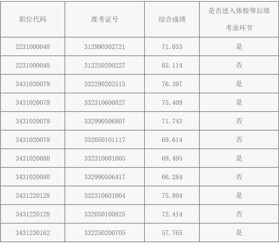 在面試合格分?jǐn)?shù)線以上人員中,按照綜合成績(jī)排名和職位招錄人數(shù),等額確定進(jìn)入體檢和考察的人選。