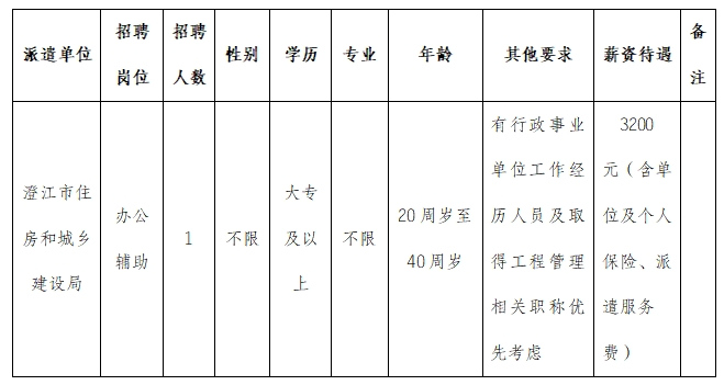 澄江市住房和城鄉(xiāng)建設局因工作需要,現(xiàn)委托澄江市啟澄人力資源有限責任公司,面向社會公開招聘辦公輔助工作人員1名,現(xiàn)將有關事項公告如下: