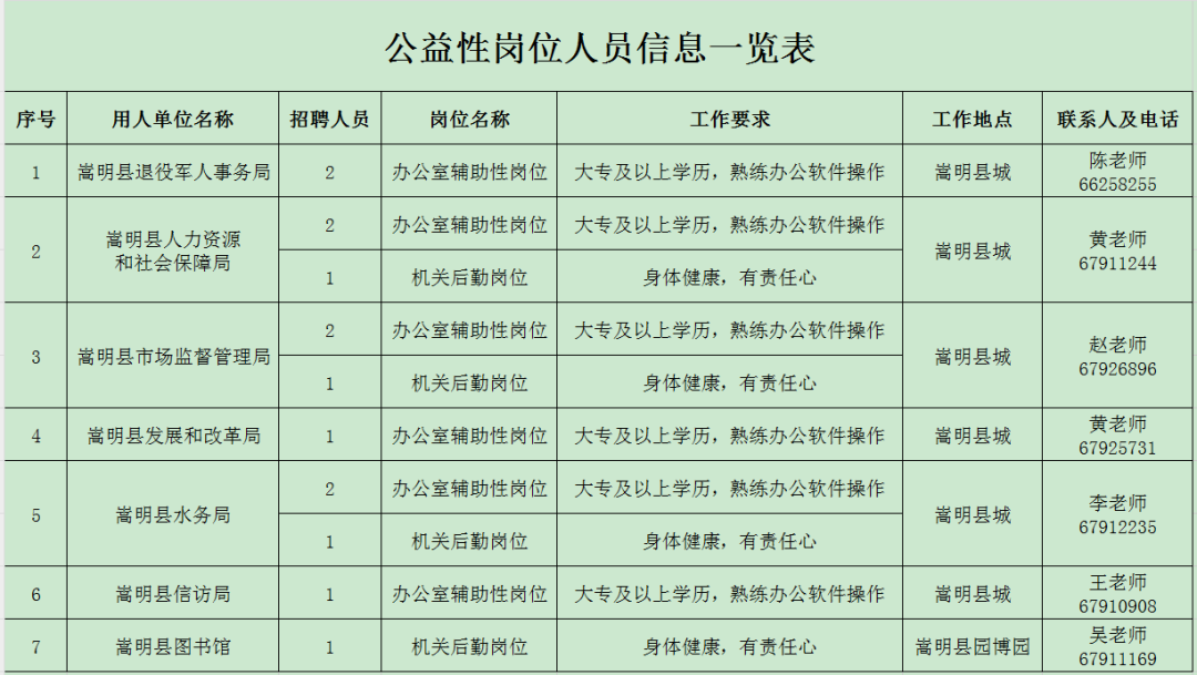 招聘具體事宜請咨詢用人單位。符合公益性崗位上崗條件的個人也可以到嵩明縣政務(wù)服務(wù)中心2號樓2樓人社23-24號窗口申請公益性崗位求職登記,詳詢羅老師:0871-67917444。崗位公示時間:2025年5月19日-2025年5月23日。