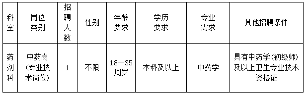 一、此次面向社會公開招聘中藥師1名,共計1人。(性別不限)