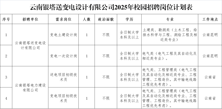 云南銀塔送變電設(shè)計(jì)有限公司2025年校園招聘公告