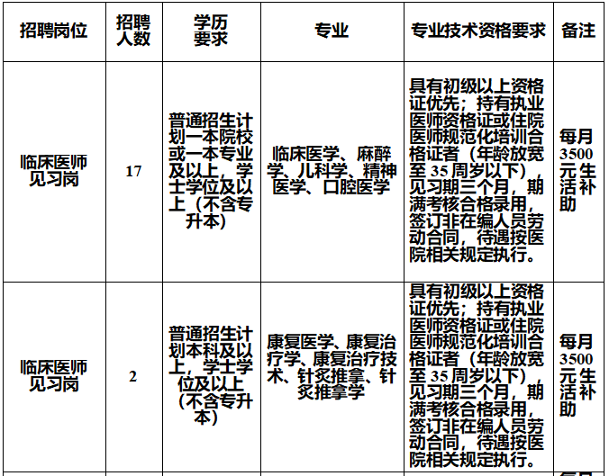 (二)見(jiàn)習(xí)期間給予相應(yīng)生活補(bǔ)助費(fèi),臨床醫(yī)師見(jiàn)習(xí)崗每人每月不低于3500元;大學(xué)生就業(yè)見(jiàn)習(xí)崗、綜合服務(wù)就業(yè)見(jiàn)習(xí)崗每人每月不低于2500元(大學(xué)生就業(yè)見(jiàn)習(xí)崗中屬臨床醫(yī)院專業(yè)普通招生計(jì)劃一本院校(或一本專業(yè))及以上、學(xué)士學(xué)位及以上的每人每月不低于3500元)。