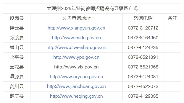(三)大理州特崗教師招聘官方網(wǎng)站為大理州人民政府官網(wǎng)(http://www.dali.gov.cn)以及各縣公布的官方網(wǎng)站(見附表)。因查看其他渠道的錯(cuò)誤信息造成的報(bào)考失誤,由考生自行負(fù)責(zé)。