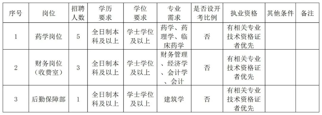 擬公開招聘編外工作人員9人,其中:藥學(xué)崗位5人,財(cái)務(wù)崗位(收費(fèi)室)3人,后勤保障部崗位1人。招聘的具體崗位、資格條件如下: