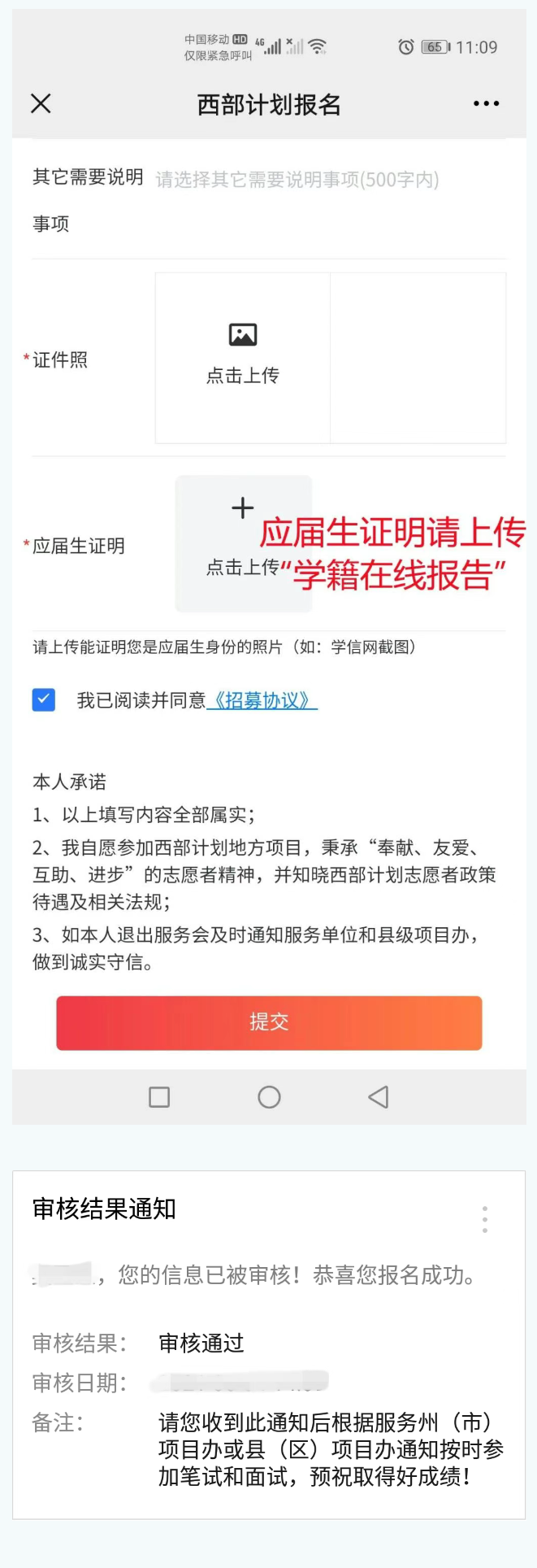 證件照上傳小一寸照片即可,勾選“我已閱讀并同意《招募協(xié)議》”,點擊提交即完成本次網(wǎng)絡(luò)報名。