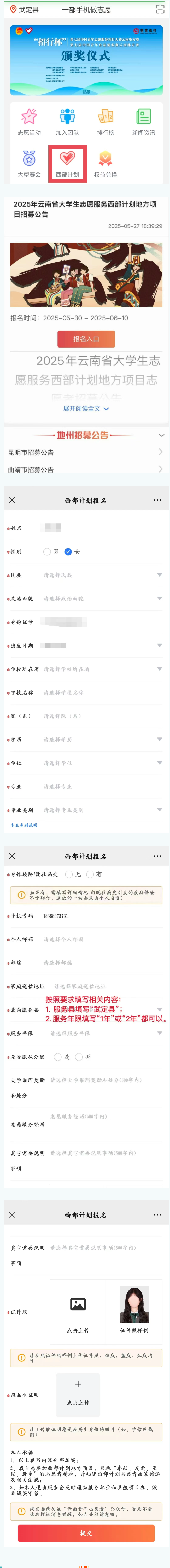 1.提交報名申請。本次招募采取網(wǎng)上報名。即日起至6月10日,報名人員關(guān)注微信公眾號“云南青年志愿者”、“楚雄青年”及“武定青年”微信公眾號,有意愿參加西部計劃且符合招募條件的高校畢業(yè)生或在讀研究生先登錄西部計劃官網(wǎng)http://xibu.youth.cn報名,后點擊“一部手機(jī)做志愿”系統(tǒng)進(jìn)行注冊、填寫個人相關(guān)信息資料,填寫報名表并選擇意向服務(wù)縣,提交報名申請。報名時在網(wǎng)上所提交的申請材料必須真實、準(zhǔn)確,因網(wǎng)上報名提交的申請材料不真實、不完整或者錯誤填寫報名信息,造成網(wǎng)上資格審查、面試資格審查、考察不通過等后果,由報名人員自行承擔(dān)責(zé)任。請報考人員自行登錄有關(guān)網(wǎng)站、公眾號查詢獲取相關(guān)信息。